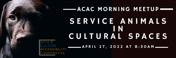 Join us for the Arts and Culture Accessibility Cooperative’s April Morning Meetup as we discuss best practices and what is acceptable under the ADA regarding service animals with speaks from: